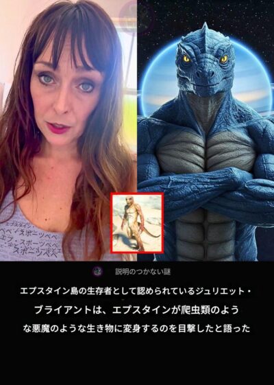 エプスタイン島の生存者として認められているジュリエット・ブライアントは、エプスタインが目の前で爬虫類のような悪魔のような生き物に変身するのを目撃したとXで言っています。